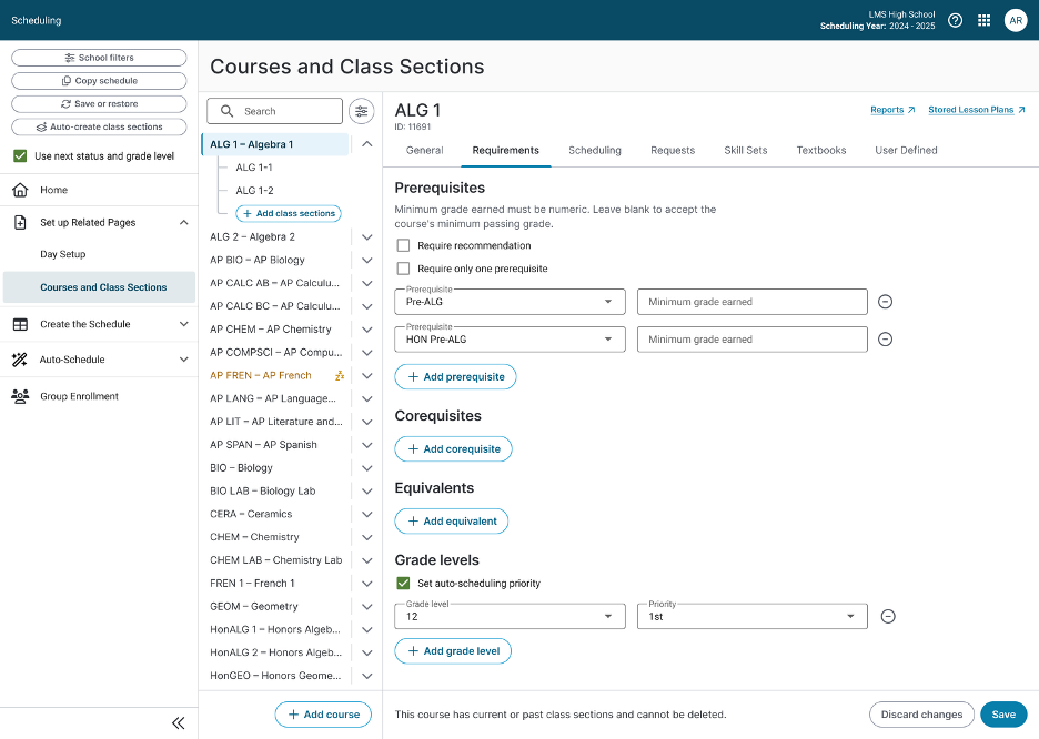 Need: The ability to set a minimum required grade from a prerequisite course to take the next level course. The ability to treat prerequisites as a “any of these prerequisites count” versus “all of these prerequisites must have been taken” (current functionality). The ability to set an enrollment priority based on grade level for the auto-scheduler.